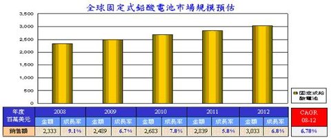 (2)鉛酸電池分為啟動(dòng)、動(dòng)力及固定式三種,近來(lái)以固定式VRLA電池成長(zhǎng)性佳。