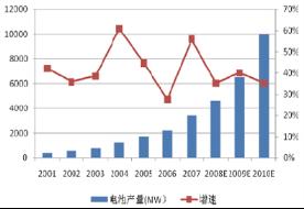 圖2 全球太陽能電池產(chǎn)量及增速