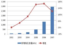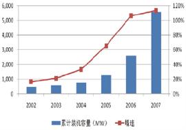 數(shù)據(jù)顯示,2007年中國風(fēng)電新增裝機量約345萬kW,占全球風(fēng)電新增裝機量2008萬kW的17.2%,居全球第三位,而同期中國風(fēng)電企業(yè)約183萬kW的機組產(chǎn)量僅占全球2110萬kW機組產(chǎn)量的8.66%。2007年中國光伏企業(yè)的電池產(chǎn)量占全球4000MW的27.2%,位居全球第一,但同期中國的20MW太陽能電池裝機量僅占全球裝機量的0.71%。