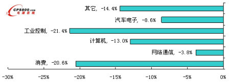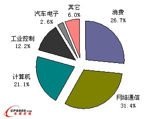 2009年上半年計算機(jī)類、消費(fèi)類、網(wǎng)絡(luò)通信類三大領(lǐng)域仍然占中國電源管理芯片市場近80%的市場份額,其中網(wǎng)絡(luò)通信類市場最大,其市場份額都超過了30%。從發(fā)展速度來看,往年發(fā)展速度最快的汽車電子類的電源管理芯片市場也出現(xiàn)了8.6%的下滑,而網(wǎng)絡(luò)通信累電源管理芯片市場雖然也出現(xiàn)了一定降幅,但由于中國3G市場的帶動,其市場僅出現(xiàn)3.8%的降幅,是所有電源管理芯片應(yīng)用領(lǐng)域中降幅最小的領(lǐng)域。而在行業(yè)整體下滑的背景下,工業(yè)控制類電源管理芯片市場則由于沒有明顯的市場推動因素而出現(xiàn)21.4%的大幅下降。消費(fèi)電子類集成電路市場的下降幅度雖然也出現(xiàn)了超過20%的下降幅度,但是未來隨著中國家電下鄉(xiāng)的拉動,市場的降幅可能會逐漸縮小。其它領(lǐng)域和計算機(jī)領(lǐng)域的發(fā)展速度則基本與整體市場持平。整體來看,所有領(lǐng)域的電源管理芯片市場都在下滑,但是由于網(wǎng)絡(luò)通信領(lǐng)域的降幅較小而工業(yè)控制領(lǐng)域的降幅較大,因此2009年上半年,應(yīng)用于網(wǎng)絡(luò)通信領(lǐng)域的電源管理芯片市場份額同比有所提升,而工業(yè)控制領(lǐng)域的份額則同比下滑。