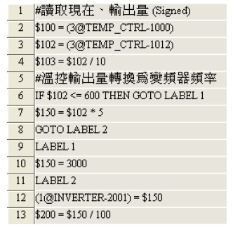 于理論的學(xué)理上,馬達(dá)的轉(zhuǎn)速和耗能為3 次方關(guān)系,因此當(dāng)馬達(dá)的頻率由60Hz 降為30Hz 時(shí),此時(shí)的耗能只需1/8。但由于空調(diào)環(huán)境中有人員產(chǎn)生CO2 的問題,因此經(jīng)驗(yàn)上通常最低的運(yùn)轉(zhuǎn)頻率為不低于30Hz,以達(dá)到空氣正常循環(huán)的要求。而冰水閥的開度調(diào)整可適時(shí)調(diào)節(jié)冰水流量,若是系統(tǒng)中有多部冰水機(jī)供應(yīng)冰水,此時(shí)也可利用PLC 程序判斷是否要將部份冰水機(jī)卸載以減少多部冰水機(jī)連轉(zhuǎn)所造成的能源浪費(fèi)。