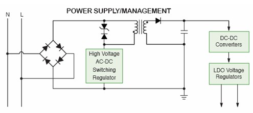 在這方面安森美半導體有豐富的器件可供使用,比如在AC-DC轉(zhuǎn)換應用方面,有用于低功率離線電源的自供電高電壓單片開關穩(wěn)壓器NCP1010-4、用于中等功率離線電源的單片開關穩(wěn)壓器NCP1027、高電壓門控振蕩器單片開關穩(wěn)壓器NCP1050-5;在DC-DC轉(zhuǎn)換應用方面,有3A開關穩(wěn)壓器NCP3170和NCP3155、1.5開關穩(wěn)壓器或用作高達5A控制器的NCP3063/4、0.5A/1.0 A/3A開關穩(wěn)壓器LM2594/5/6、PWM控制器NCP3020/11和NCP1034;在LDO方面,有500mA LDO線性穩(wěn)壓器NCP5500、200mA輸出LDO線性穩(wěn)壓器NCP4588、50/150mA線性穩(wěn)壓器NCP4640/1、100mA LDO線性穩(wěn)壓器LP2951和80mA LDO線性穩(wěn)壓器NCP562。這些產(chǎn)品在應用中的位置如圖1所示。這些電源方案具有高能效、低能耗及豐富的保護特性等特點,非常適合智能電表應用。