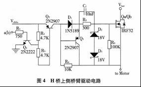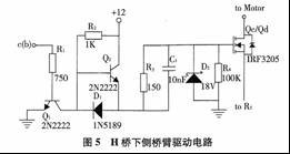 當(dāng)MOSFET的控制信號(hào)c(d)低電平時(shí), Q1截止,Q2導(dǎo)通,電源通過Q2以及R3與C,組成的并聯(lián)電路對(duì)Qc的柵極充電,直至Qc完全導(dǎo)通。當(dāng)Qc導(dǎo)通時(shí),其柵-源極電壓等于電源電壓減去Q2的集-射極飽和導(dǎo)通電壓,而電源電壓又等于蓄電池電壓減去1N5819二極管的正向?qū)妷。所以,Qc的柵-源極電壓VGS=(Vbat-VCE-VF),當(dāng)蓄電池電壓為12V,取各參數(shù)為典型值得Qc的柵-源極電壓為11.26V,滿足IRF3205的柵極驅(qū)動(dòng)(10V)所需的電壓