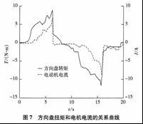 根據(jù)電動(dòng)轉(zhuǎn)向控制系統(tǒng)對(duì)穩(wěn)定性和跟蹤性的需要,采用最優(yōu)H二控制器編制電動(dòng)轉(zhuǎn)向系統(tǒng)控制程序,并在汽車電動(dòng)轉(zhuǎn)向試驗(yàn)臺(tái)上進(jìn)行臺(tái)架模擬試驗(yàn),車速信號(hào)用模擬車速傳感器發(fā)出的脈沖信號(hào)代替網(wǎng)。圖7為中等車速轉(zhuǎn)向助力時(shí),測(cè)量的方向盤轉(zhuǎn)矩(T)和助力電動(dòng)機(jī)電流(I)變化曲線。從圖7中可以看出,在轉(zhuǎn)向過程中,助力電動(dòng)機(jī)電流隨著方向盤轉(zhuǎn)矩的變化而變化,電動(dòng)機(jī)電流的變化趨勢(shì)和方向盤轉(zhuǎn)矩的變化趨勢(shì)相吻合,表明電動(dòng)機(jī)的助力轉(zhuǎn)矩對(duì)方向盤轉(zhuǎn)矩有良好的跟蹤性能。轉(zhuǎn)向操作時(shí),無助力滯后感,轉(zhuǎn)向平穩(wěn),表明轉(zhuǎn)向系統(tǒng)具有良好的跟蹤性能和操縱穩(wěn)定性。