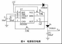 電源倍壓電路如圖6所示,NE555定時(shí)器工作于多諧振蕩器模式,于引腳3產(chǎn)生幅值等于NE555的供電電壓,頻率為1/0.7(R2+2R1)C1的矩形波。C3、C4,Dl和D2構(gòu)成電荷泵電路。當(dāng)NE555引腳3輸出高電平時(shí),由于電容電壓不能突變,C3正極電壓為24V或接近24V,并通過D2向C4充電,使C4電壓為24V或接近24V。由于受電路的工作效率、二極管D1和D2上的正向電壓降以及負(fù)載能力的限制,使得系統(tǒng)輸出電壓低于供電電壓的2倍。