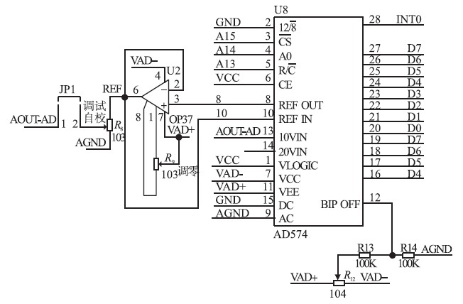 A/ D 采樣輸入電路如圖4 所示。為了滿足取樣精度需要,我們選擇12 bit A/ D 轉(zhuǎn)換器和12 bitD/ A 轉(zhuǎn)換器,使步進(jìn)小于1 mA,在電路中A/ D 啟動后,先讀高8 位結(jié)果,再讀后4 bit;D/ A 是先寫入高8 bit,再寫入低4 bit.