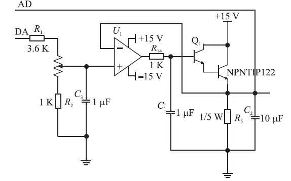 恒流源電路原理結(jié)構(gòu)圖如圖2 所示,由于D/ A轉(zhuǎn)換輸出的模擬信號不穩(wěn)定,加上C3 穩(wěn)定電壓。經(jīng)過3.6 K 的電阻和1 K 的電位器加到單運(yùn)放OP07 的同相輸入端,調(diào)節(jié)電位器的阻值的大小可調(diào)節(jié)同相輸入端的電位,從而改變輸出點的電位,輸出電位加到達(dá)林頓管的B 管腳上,進(jìn)入達(dá)林頓信號產(chǎn)生自激信號,通過C1過濾掉。利用達(dá)林頓管的電流放大特性,可實現(xiàn)大電流的輸出,電流放大倍數(shù)為1 000 ~15 000倍。