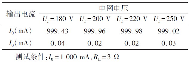 電源穩(wěn)定度測試數(shù)據(jù)如表1 所示。其中電源穩(wěn)定度是指在容許電網(wǎng)波動范圍條件下,對輸出電流穩(wěn)定度的影響。測試條件為I0 =1 000 mA,RL =3Ω,測試數(shù)據(jù)表明電網(wǎng)電壓在180 V ~250 V 波動時,輸出電流最大偏差為0.99 mA,紋波電流小于0.05 mA,輸出電流和紋波電流均達(dá)到設(shè)計要求。