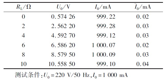 負(fù)載穩(wěn)定性測試條件為U0 =220 V/50 Hz,I0 =1000 mA,測試數(shù)據(jù)如表2 所示,其中負(fù)載穩(wěn)定度是指一定的工作情況下,負(fù)載變化引起的輸出電流變化。測試數(shù)據(jù)表明負(fù)載在0 ~10 贅變化時,輸出電流最大偏差為0. 99 mA,紋波電流小于0. 05 mA.