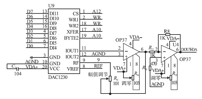 D/ A 控制輸出電路如圖5 所示。該單片機(jī)的輸入信號為經(jīng)過12 bit 的A/ D 轉(zhuǎn)換器的數(shù)字量,送入單片機(jī)處理后產(chǎn)生輸出數(shù)字量經(jīng)D/ A 轉(zhuǎn)換后送入恒流源,因而這種數(shù)控恒流源的精度最終取決與電路中A/ D 和D/ A 轉(zhuǎn)換器的轉(zhuǎn)換精度。