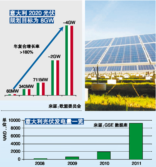 在補(bǔ)貼負(fù)擔(dān)日益沉重的同時(shí),光伏電池板價(jià)格大幅下滑。2008年貝盧斯科尼重掌政權(quán),中右翼政府上臺(tái)后就此展開了激烈討論,意大利最終在2010年頒布第三能源法案,其核心被外界解讀為下調(diào)FIT。為了達(dá)到歐盟整體的氣候變化和能源目標(biāo),意大利同時(shí)還制訂了本國的光伏發(fā)展規(guī)劃:計(jì)劃到2020年全國光伏裝機(jī)要達(dá)到8吉瓦。但很多市場(chǎng)人士認(rèn)為,8吉瓦的目標(biāo)野心太大,很有可能完不成。