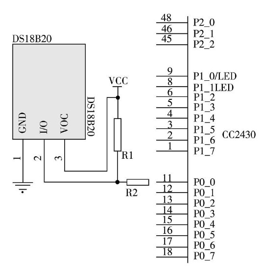 對于糧庫的監(jiān)控,不僅要監(jiān)控糧倉的溫濕度,而且也要監(jiān)控糧堆的溫度。對溫度傳感器的選型,這里采用DS18B20.DS18B20 是一款全數(shù)字溫度轉(zhuǎn)換及輸出傳感器。從DS18B20 讀出信息或是寫入DS18B20信息僅需要1 根口線( 即單總線接口) .溫度變換、讀取等所需的能量由總線提供,無需外接電源。使用DS18B20 可以節(jié)省系統(tǒng)資源、使系統(tǒng)結(jié)構(gòu)更趨簡單,可靠性更高,更節(jié)能,更適用于溫度緩變場所的長時間溫度監(jiān)測。最高分辨率達到12 位,精度可達±0. 5℃。基于DS18B20 溫度傳感器節(jié)點設(shè)計如圖4 所示。