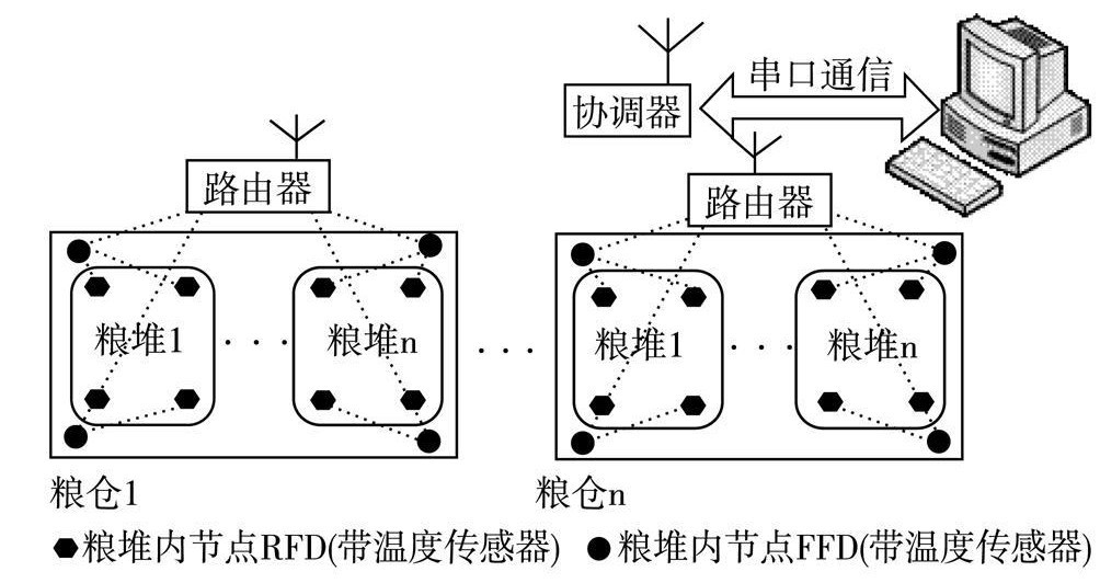 圖1 基于ZigBee 的糧倉溫濕度監(jiān)控系統(tǒng)結(jié)構(gòu)示意圖