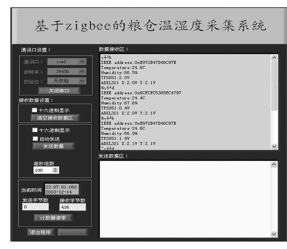 經(jīng)過上面的步驟,糧倉溫濕度監(jiān)控系統(tǒng)可以實時監(jiān)控糧倉的溫濕度變化,為更便捷地實現(xiàn)數(shù)據(jù)觀測,糧倉溫濕度采集系統(tǒng)上位機監(jiān)控界面采用圖形化的編程語言LabVIEW 軟件編寫,實現(xiàn)對終端監(jiān)測節(jié)點上傳數(shù)據(jù)的采集與處理,并實時顯示各個節(jié)點的IEEE 號和溫濕度數(shù)據(jù)。糧倉溫濕度采集系統(tǒng)監(jiān)控界面如圖5 所示。在進行PC 機和無線采集模塊串行通信前,首先配置好串口,即串口初始化,使計算機串口的各種參數(shù)設(shè)置與無線收發(fā)模塊的串口參數(shù)保持一致,以致能夠正確的通信。由圖5 可見,所設(shè)計的界面反映了各節(jié)點所采集的溫度和濕度,圖中,0x6CFCFC5385FC4797 和0xE972B47D46C97E 分別是兩個CC2430 節(jié)點的IEEE 地址,24.6℃和24.4℃表示兩個節(jié)點的溫濕度傳感器所采集到的溫度,66. 5%和67. 6%表示為兩個節(jié)點采集到的濕度。