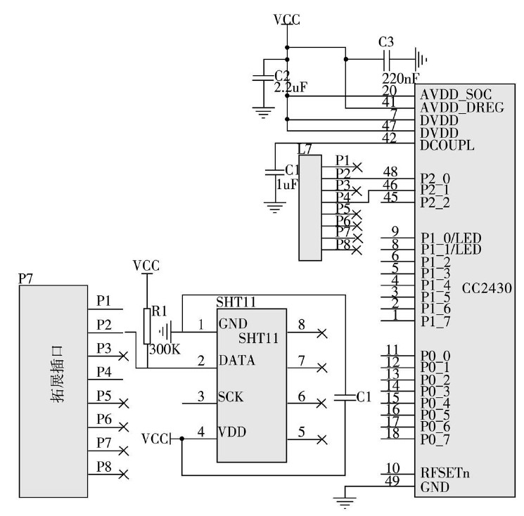 CC2430 通過I2C 接口定時讀出SHT11 的溫濕度數(shù)據(jù),并將溫濕度通過無線網(wǎng)絡(luò)傳送。SHT11 采用串行與處理器進行數(shù)據(jù)通信,SCK 數(shù)據(jù)線負責(zé)處理器和SHT11 的通訊同步; DATA 三態(tài)門用于數(shù)據(jù)的讀取。為避免信號沖突,微處理器應(yīng)驅(qū)動DATA 在低電平。需要一個外部的上拉電阻將信號提拉至高電平,設(shè)計過程中,將SHT11 溫濕度傳感器與一個拓展插口P7 接在一起,獨立做成一個小模塊,便于與無線模塊模板的連接,用CC2430 芯片發(fā)送采集數(shù)據(jù)到無線模塊模板上的CC2430 芯片。SHT11 溫濕度傳感器模塊的P7 對應(yīng)CC2430 模板的L7 口,CC2430 模板既用來對SHT11 溫濕度模塊供電也用來對CC2430 芯片供電,無線模塊模板與SHT11 溫濕度傳感模塊的連接電路圖如圖3 所示。