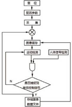 系統(tǒng)工作流程為:系統(tǒng)上電后,F(xiàn)PGA從外部EEPROM自動(dòng)加載程序,I2C模塊對(duì)CIS進(jìn)行初始化工作參數(shù)配置。 CIS向FPGA輸入圖像數(shù)據(jù)信號(hào),F(xiàn)PGA將采集的原始數(shù)據(jù)(RAW)轉(zhuǎn)換成RGB格式,幀緩沖模塊(Frame Buffer)每次將相鄰兩幀圖像數(shù)據(jù)寫(xiě)入SDRAM,然后比較這兩幀圖像的差值,如果差值大于設(shè)定的閾值,并且人體探測(cè)器輸出高電平,就認(rèn)為檢測(cè)到了外 界場(chǎng)景的運(yùn)動(dòng),系統(tǒng)會(huì)自動(dòng)將捕獲的圖像輸出到SD卡進(jìn)行存儲(chǔ)。圖2給出了系統(tǒng)的工作流程。