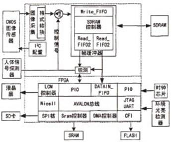 為了實(shí)現(xiàn)自動(dòng)圖像報(bào)警和圖像采集,本文設(shè)計(jì)了動(dòng)體檢測(cè)算法,這是因?yàn)榻^大多數(shù)情況下我們只對(duì)監(jiān)控區(qū)域中運(yùn)動(dòng)的物體感興 趣,這樣可以過(guò)濾掉只包含靜態(tài)背景的圖像,從而降低了對(duì)有限的嵌入式硬件資源的消耗。由于活動(dòng)物體大多是人,而且這也是圖像監(jiān)控的目標(biāo),為此加入了人體信 號(hào)探測(cè)器,用以輔助動(dòng)體檢測(cè),以達(dá)到降低圖像報(bào)警誤報(bào)率的目的。本系統(tǒng)主要集成了圖像采集、控制和存儲(chǔ)等器件或芯片,組成了以FPGA為控制核心的實(shí)時(shí)圖 像監(jiān)控系統(tǒng)。系統(tǒng)的總體方案如圖1所示。
