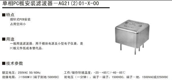AG21(2)01-X-00單相PC板安裝濾波器