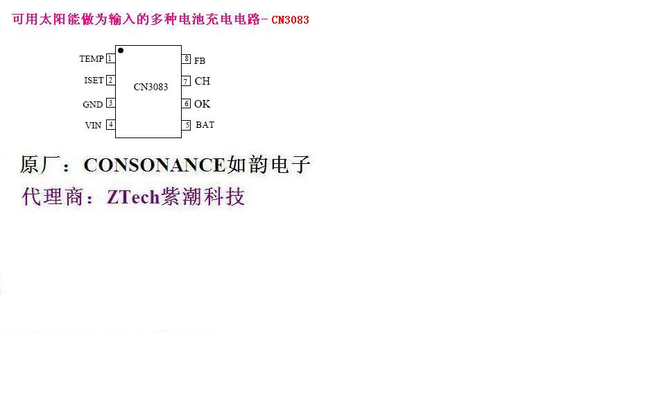 CN3083是可以用太陽能板供電的單節(jié)鋰電池充電管理芯片。該器件內(nèi)部包括功率晶體管,應(yīng)用時(shí)不需要外部的電流檢測電阻和阻流二極管。內(nèi)部的8位模擬-數(shù)字轉(zhuǎn)換電路,能夠根據(jù)輸入電壓源的電流輸出能力自動(dòng)調(diào)整充電電流,用戶不需要考慮最壞情況,可最大限度地利用輸入電壓源的電流輸出能力,非常適合利用太陽能板等電流輸出能力有限的電壓源供電的鋰電池充電應(yīng)用。CN3083只需要極少的外圍元器件,并且符合USB總線技術(shù)規(guī)范,非常適合于便攜式應(yīng)用的領(lǐng)域。熱調(diào)制電路可以在器件的功耗比較大或者環(huán)境溫度比較高的時(shí)候?qū)⑿酒瑴囟瓤刂圃诎踩秶鷥?nèi)。內(nèi)部固定的恒壓充電電壓為4.2V,也可以通過一個(gè)外部的電阻調(diào)節(jié)。充電電流通過一個(gè)外部電阻設(shè)置。當(dāng)輸入電壓掉電時(shí),CN3083自動(dòng)進(jìn)入低功耗的睡眠模式,此時(shí)電池的電流消耗小于3微安。其它功能包括輸入電壓過低鎖存,自動(dòng)再充電,電池溫度監(jiān)控以及充電狀態(tài)/充電結(jié)束狀態(tài)指示等功能。