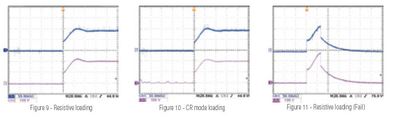 圖9是以真實(shí)電阻為負(fù)載的拉載電流波形(藍(lán)色);圖10為定電阻模式仿真真實(shí)電阻的拉載電流波形(藍(lán)色);圖9與圖10的電流與LED為負(fù)載的電流波形有相當(dāng)大差異,且電流及電壓都有過沖的情況發(fā)生,易導(dǎo)致LED driver在開機(jī)時(shí)發(fā)生過電壓或過電流保護(hù),如圖11所示。因此不管是真實(shí)電阻或是電子負(fù)載的定電阻模式,都比較無法仿真真實(shí)的情況。