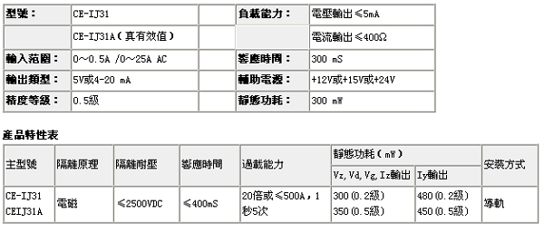 CE-IJ31A無(wú)Vg輸出方式,等級(jí)指數(shù)現(xiàn)只有0.5級(jí)。選型示例:CE-IJ31-32BS3-0.5/0~5A描 述:輸入三相交流電流:0~5A,輸出:0~5V DC,輔助電源:+12V,孔徑:ф6.5mm,等級(jí)指數(shù):0.5級(jí),S3型電量隔離變送器。